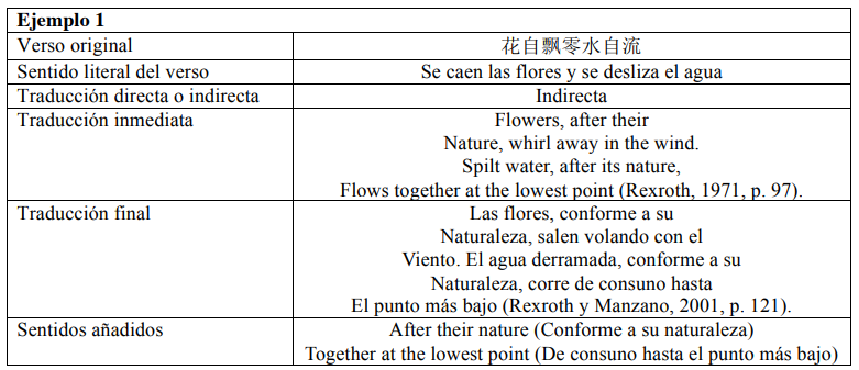 En el caso de la Tabla 3, el traductor de la versión inglesa, Kenneth Rexroth, ha agregado las locuciones “after their nature (conforme a su naturaleza)” y “together at the lowest point (de consuno hasta el punto más bajo)”. Sin embargo, en comparación con los ejemplos anteriores de traducción directa, consideraríamos que estos elementos no son tan necesarios para enriquecer la descripción ni fortalecer los sentimientos. Funcionarían solo para mejorar la forma estilística, porque los dos versos traducidos tienen la estructura similar y en ambos aparecen “after their nature (conforme a su naturaleza)”.