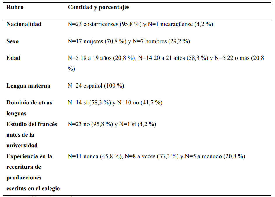 El grupo de personas participantes está conformado por estudiantes que cursan el segundo año de la carrera. Se utilizó un muestreo no probabilístico por conveniencia. Una vez escogida la población participante, se le explicó en qué consistía la investigación y su participación en la misma. Se le presentó el consentimiento informado y se le aclaró todas las dudas con respecto a su participación. También se le indicó que se podía retirar en cualquier momento de la investigación y que los datos recogidos no serían tomados en cuenta en caso de retiro de la persona participante. Para los criterios de inclusión en esta investigación, se tomaron en cuenta los siguientes: estudiantes de segundo año, matriculados en el curso de gramática en el primer semestre del 2020, el español como lengua materna y haber realizado el primer año de la carrera en una universidad pública. Participaron 24 estudiantes en este estudio. En la Tabla 1, se resume la información de las personas participantes:
