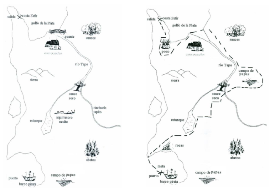 Consiste en un juego entre el informante y el investigador. Ambos tienen un mapa en el que hay un punto de salida y un punto de llegada, pero los elementos que componen los mapas no son necesariamente iguales, sino que pueden tener variaciones de uno a otro, como se observa en la Figura 1. Este corpus permite que entre el informante y el investigador se generen preguntas y respuestas de manera espontánea hasta que uno logre guiar al otro al punto de llegada e identifique los elementos faltantes.