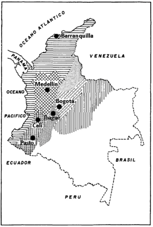 En el caso de AMPER-Col, además de lo anterior, se tuvo en cuenta la distribución político-administrativa y la relevancia de las localidades desde el punto de vista nacional. Por tanto, las localidades seleccionadas eran capitales de departamento y tenían el mayor porcentaje de población en comparación con el resto. Así mismo, se tuvo en cuenta que las capitales pertenecieran a un área dialectal según lo sugerido por Flórez (1961). El investigador propone una división en siete grupos: costeño (Atlántico y Pacífico), antioqueño, nariñense-caucano, tolimense, cundiboyacense, santandereano y llanero. Cada uno de ellos, excepto los dos últimos, representados por Barranquilla, Medellín, Pasto-Cali e Ibagué respectivamente (ver Figura 2).