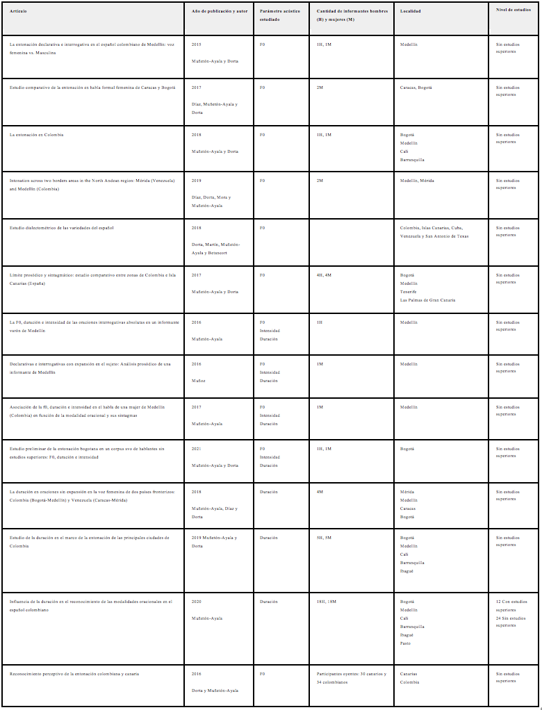 Nuestro método de revisión se centra en dos puntos: 1) reconocer la estructura y el funcionamiento interno del proyecto; 2) rastrear los principales artículos publicados en el marco de AMPER Colombia. Para ello, en la Tabla 1, presentamos el título del artículo, el año de publicación, las autoras o los autores, el parámetro acústico estudiado, la cantidad de informantes que participaron en el estudio, la localidad a la cual pertenecen y el nivel de estudios de cada uno de las y los informantes.