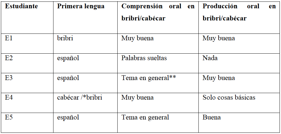 Con la finalidad de recabar datos sobre el perfil sociolingüístico de los estudiantes, se solicitó completar un instrumento breve al inicio del curso-taller. Los resultados que se presentan a continuación corresponden a los cinco estudiantes16 ya mencionados. En primer lugar, todos los participantes respondieron “sí” a la pregunta “¿En su familia se utiliza el bribri / cabécar en la comunicación cotidiana?”. Esta respuesta sugiere que, al menos, todos los estudiantes poseen algún grado de competencia en las lenguas originarias de su comunidad.
