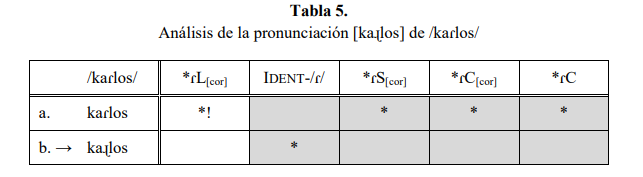 En la Tabla 4 se ilustra la realización de /ɾ/ ante /l/ en el habla de una persona que no presenta lenición en este entorno. En todas las tablas se empleará el símbolo [ɻ] en función de comodín para representar cualquier realización no vibrante de /ɾ/; no necesariamente es una aproximante retrofleja. Como se observa, Ident-/ɾ/ se encuentra por encima de las cuatro restricciones de marcadez, por lo que se mantienen los rasgos del fonema /ɾ/ en la realización fonética, de modo que se pronuncia como vibrante. El candidato con lenición, (b), es eliminado por violar justamente esta restricción. El resto de los candidatos están incluidos en la tabla para visualizar cómo las demás restricciones de fidelidad previenen la elisión, la inserción de una vocal, la eliminación de la roticidad y el uso de una rótica no coronal, respectivamente.11 Esta jerarquización corresponde al español hablado en Costa Rica antes de que surgiera el fenómeno de la lenición de /ɾ/, así como al habla de cualquier hispanohablante que no presente el fenómeno en la actualidad.