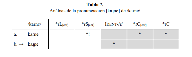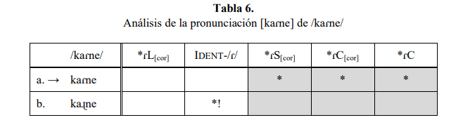 Con esta misma jerarquía, la pronunciación vibrante ante [n] (u otra consonante) se mantiene, ya que Ident-/ɾ/ tiene prioridad sobre *ɾS[cor], como se aprecia en la Tabla 6.