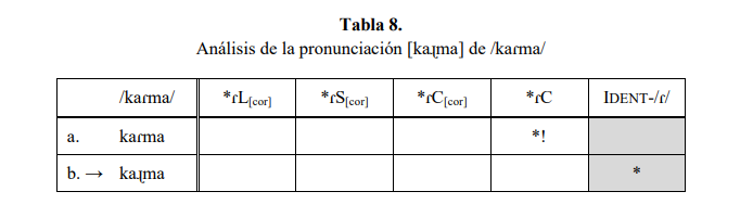 Puesto que solamente el fonema /ɾ/ sufre el proceso descrito, además de que los entornos en cuestión son muy específicos, la única manera de explicar el fenómeno dentro del marco de la teoría de la optimidad es mediante una serie de restricciones de marcadez. Estas se presentan a continuación:9