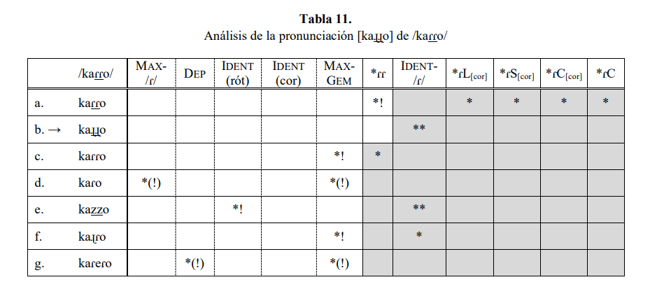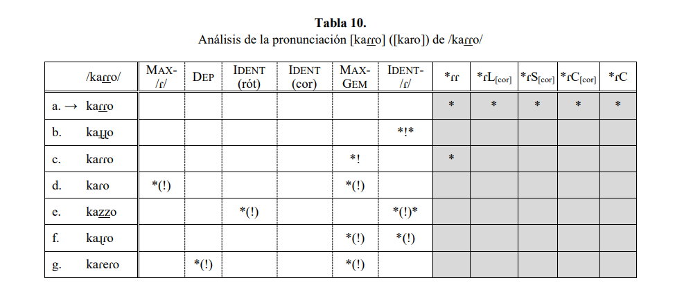 En el sistema fonológico de hispanohablantes que pronuncian todos los fonemas vibrantes como vibrantes, Ident-/ɾ/ domina a *ɾɾ, como se ilustra en el análisis de /kaɾɾo/ en la Tabla 10, donde el candidato (b), con una rótica geminada no vibrante, es eliminado precisamente por dicha restricción. Por su lado, el candidato con una secuencia de dos vibrantes simples no geminadas, (c), es excluido por Max-Gem, mientras que las demás restricciones de fidelidad se encargan de evitar cualquier otra realización fonética.