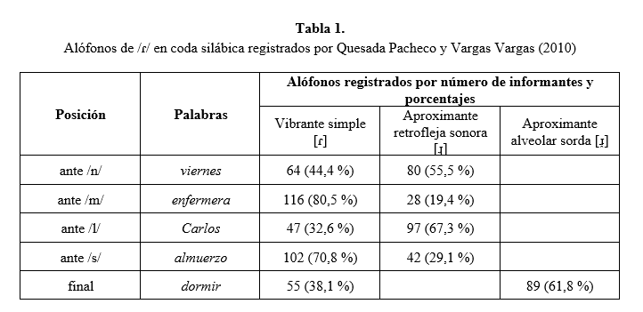 Quesada Pacheco y Vargas Vargas (2010) realizan un análisis de la pronunciación de la mayoría de los fonemas del español hablado por 36 personas de distintas localidades de toda Costa Rica. En el caso del fonema vibrante simple, este “se estudió ante las siguientes consonantes: /n/ (viernes), /m/ (enfermera), /l/ (Carlos), /s/ (almuerzo) y en posición final (dormir)” (p. 169).4El inconveniente de la presentación de los datos es que estos se expongan de manera integral, sin separar las zonas dialectales, pero los autores sí añaden un comentario al respecto: