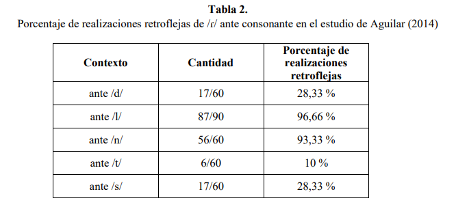 En resumen, al igual que en los otros trabajos citados, Aguilar Porras (2014) muestra que la retroflexión ocurre con mayor frecuencia ante /l/ y /n/, y que también los rasgos de [+sonoro] y [+continuo] lo propagan en cierto grado.