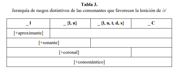 La jerarquía planteada en (1) se aprecia con mayor claridad en la Tabla 3; en la primera fila se exponen los entornos en los que están presentes los rasgos en cuestión: