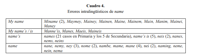También se detectan ocho errores que son una estrategia de comunicación en los que el alumnado crea una palabra a partir de la lengua materna, pero dándole apariencia de ser una palabra en inglés: nomber.