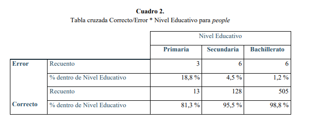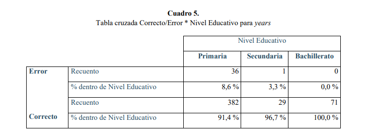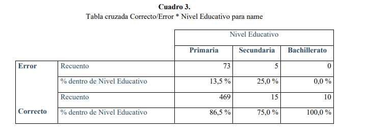 Vemos en el Cuadro 2 que Primaria es el nivel educativo con el porcentaje más alto de errores (18.8 %), seguido de Secundaria con un 4,5 % y finalmente Bachillerato con un porcentaje muy bajo (1,2 %).
