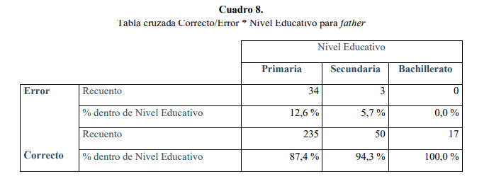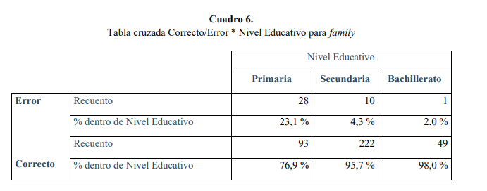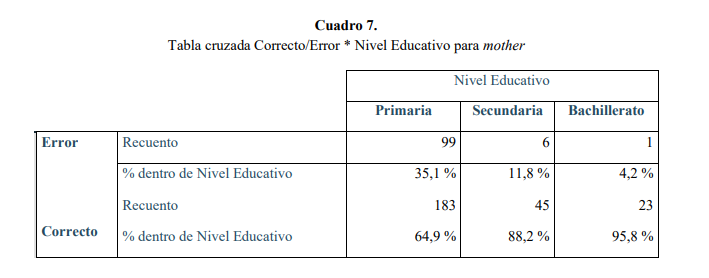 Destaca Primaria como el nivel educativo con un porcentaje muy alto de errores (35,1 %), seguido de Secundaria con un 11,8 % y, finalmente, Bachillerato con un porcentaje más bajo (4,2 %), tal como vemos en el Cuadro 7:
