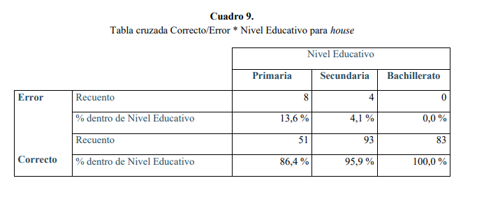 Como podemos apreciar en el Cuadro 8, el porcentaje de errores es bajo en los tres niveles: 12,6 % para Primaria, 5,7 % para Secundaria y 0,0 % para Bachillerato.