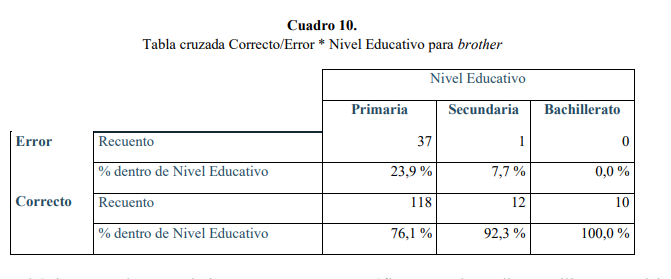 El primer dato que llama la atención son los altos porcentajes que se dan con mother. Es el porcentaje más alto en Primaria y también en Bachillerato. En el lado opuesto encontramos sister y years que no llegan a tener un 12 % de errores al sumar los tres niveles.