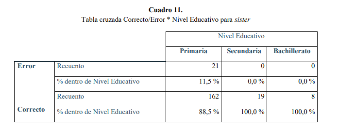 Como podemos ver en el Cuadro 11, los errores se limitan a Primaria. Aparentemente esta palabra inglesa no debería presentar dificultad al alumnado pues se podría afirmar, con las cautelas necesarias, que la pronunciación en inglés coincide con su forma escrita. La influencia que ejercen algunas palabras del mismo campo semántico (father, mother y brother) provocan un error ortográfico de clara influencia intralingüística: sisther aparece 10 veces en Primaria, casi la mitad del total de errores. Otros errores de Primaria parecen ser faltas de ortografía: sirter, siste (3), sixter (3), sistor (2) y sistar. También hay un caso en Primaria de estrategia de comunicación, en el que se da apariencia inglesa a la palabra española correspondiente: herma.