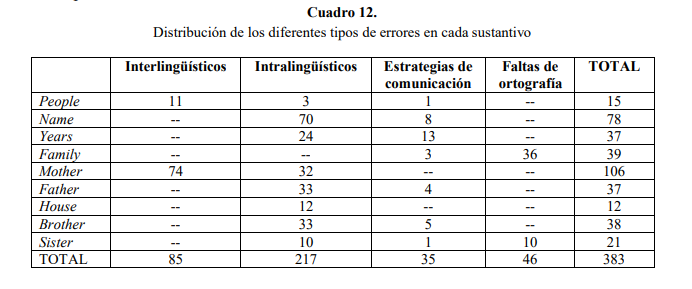 En cuanto al tipo de errores que nos hemos encontrado, hay un total de 383 errores en los nueve sustantivos. De ellos 85 son interlingüísticos, 217 intralingüísticos, 35 estrategias de comunicación y, finalmente, 46 son faltas de ortografía. En el Cuadro 12 podemos ver los diferentes tipos de errores encontrados para cada uno de los sustantivos.