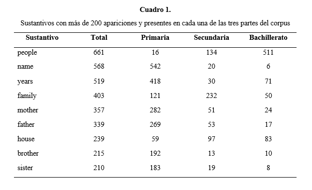 Puesto que en nuestro estudio nos interesa comprobar la importancia de los errores ortográficos y cómo evolucionan en las diferentes etapas educativas, nos vamos a limitar a los sustantivos que tengan más de 200 apariciones en el corpus y que además estén presentes en cada una de las tres etapas educativas. Esta limitación viene determinada por la necesidad de contar con un vocabulario que esté presente en los tres niveles y que el número de apariciones en cada uno de ellos sea superior a cinco para intentar así realizar cálculos estadísticos. Tal como podemos ver en el Cuadro 1, nueve sustantivos cumplen con estos requisitos.