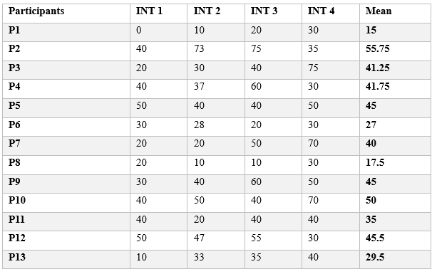 In Table 3, it can be seen that participant 2 was able to reach a level above 50 points along the four interventions sessions and participant 10 reach exactly 50 points. Therefore, only two of the 13 students showed a favourable progress after the four sessions of stage 1 of the actions plan. It is noticeable that four students performed under 30 points, being participant 1 who showed the lowest score of 15 points out of 100.