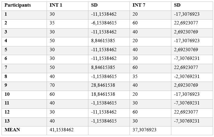 Table 5 compares performance between intervention 1 and intervention 7. While some participants improved, others showed little change or decline. The mean scores shifted from 41.15 to 37.31, indicating a slight overall decrease, with varied individual responses highlighted by the standard deviations.