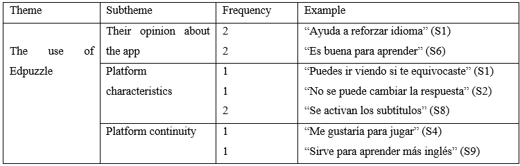 Regarding the students’ opinions in the focus group interviews, the answers were mostly positive as well, they mentioned that they liked the platform, it was easy to use, it was good to learn English. Also, they liked being able to see if their answers were correct. On the opposite, they mentioned that something negative was not having the possibility to change an answer and that sometimes the subtitles were activated.
