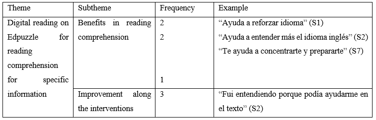 The study aimed to identify the contribution of digital reading on Edpuzzle to support fifth graders’ reading comprehension skill for specific information. Therefore, the results regarding the contribution of this method were determined using quantitative and qualitative data that helped to answer the specific objectives of this action research.