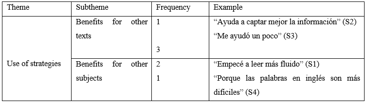 In the final set of questions, the groups were asked about how beneficial this method regarding the use of strategies was (Table 8). In terms of the benefits to understand other texts different from stories, they said the activities helped a little to catch better the information. Regarding the positive impact they could have in other subjects, two participants mentioned that their reading fluency improved in the first language and another student mentioned that reading in Spanish was easier now because words in English were more difficult to read.