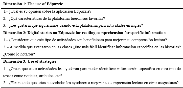 The Likert scale and the focus group were used to analyze learners’ opinions regarding the contribution of digital reading on Edpuzzle to their reading comprehension skills for specific information. The Likert scale used in this study aims to collect information about the students’ opinions after being exposed to the digital reading technique carried out during this research and check whether the results were positive and what perceptions the participants had. This instrument was created by the researchers and validated by 3 language experts. It included three different dimensions: the use of the platform Edpuzzle, digital reading on Edpuzzle to work on reading comprehension and digital reading on Edpuzzle for reading comprehension for specific information (see Appendix 1).