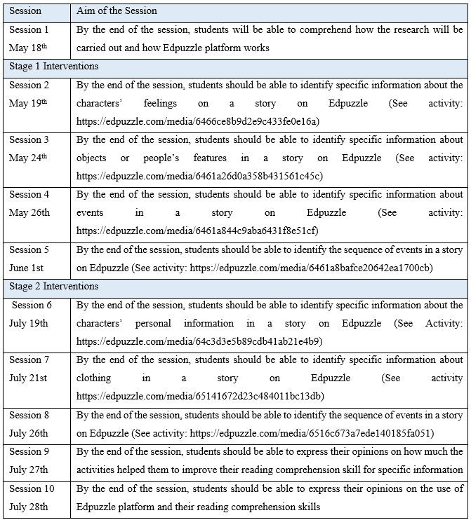 The action plan consisted of a first session presenting the action research and the use of the platform. Moreover, this plan included the implementation of two intervention stages, being the first stage of four sessions and the second stage of three more sessions to gather more data and reach more reliable results. Each session consisted of pre-teaching the vocabulary of the lesson, then do the reading tasks on Edpuzzle and finally filling an exit ticket to check the comprehension of the vocabulary and the story. After the seven interventions, the Likert scale questionnaire and the two focus groups interviews were administered (see Table 2).