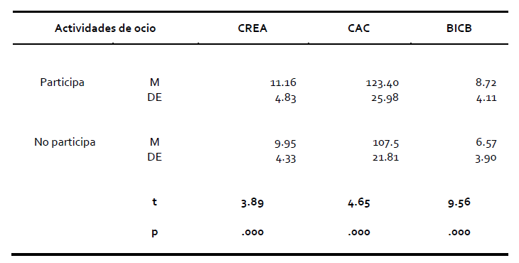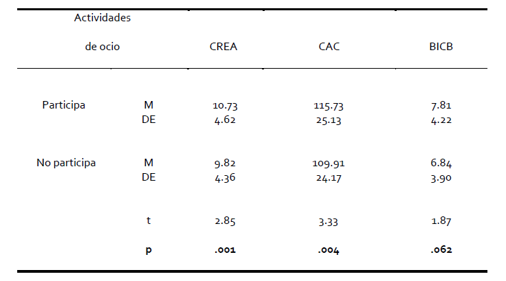 Se observó en todas las áreas y en el puntaje total del CAC diferencias de media estadísticamente significativas entre las personas que no participan y quienes participan, a favor de estos últimos. En el Test CREA y en el cuestionario BICB también se observaron diferencias significativas entre quienes participan en actividades estructuradas de ocio y quienes no lo hacen (Ver Tablas 1 y 2).