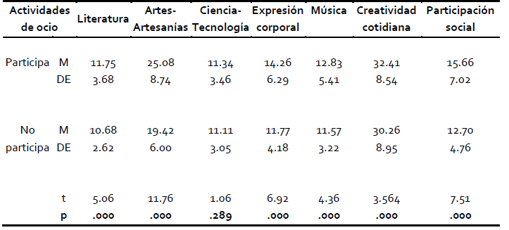 En estudios anteriores se ha observado que las personas que participan en propuestas de ocio activo obtienen puntajes más elevados en las pruebas de creatividad respecto de quienes no participan (Aranguren & Irrazabal, 2012; Elisondo, 2013; Elisondo y Donolo, 2014; Boyd Hegarty, 2009, Wolfradt & Pretz, 2001). Considerando estas evidencias y para analizar la validez del instrumento, se realizaron estudios de diferencia de media en el CAC según participación en actividades de ocio.