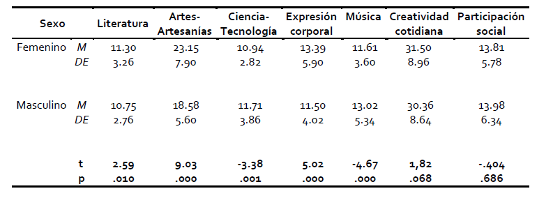 Los estudios de diferencias de media entre varones y mujeres arrojan interesantes resultados. Se observan diferencias a favor de las mujeres en las áreas artes y artesanías, expresión corporal y literatura. Las mujeres también obtuvieron medias significativamente superiores que los varones en las puntuaciones totales del CAC, el BICB y el CREA. Los varones obtuvieron puntajes medios significativamente superiores en las áreas música y ciencia (VerTablas 3 y 4).