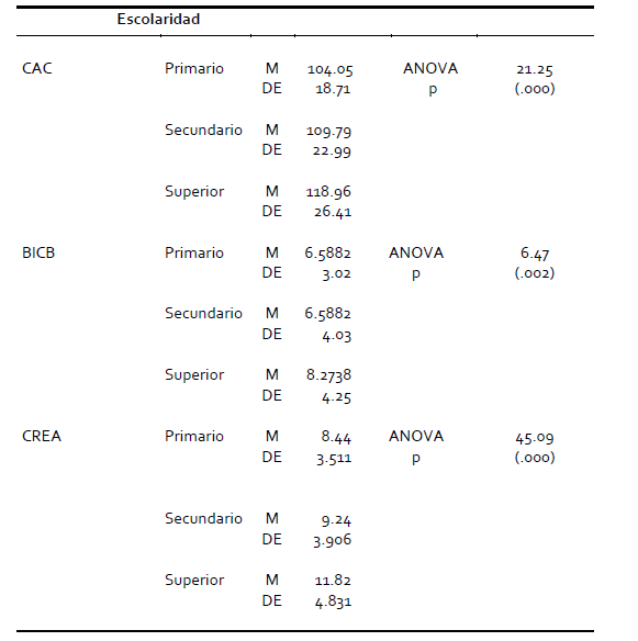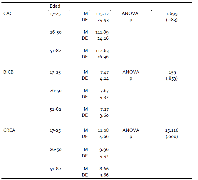 Respecto de la edad, se han considerado tres grupos: personas entre 17 y 25 años, entre 26 y 50 y de más de 50. Los estudios indican diferencias en los puntajes medios en ciencia y tecnología, literatura, música, expresión corporal y CREA, a favor de los más jóvenes. En las demás áreas y en los puntajes totales del CAC y el BICB no se observaron diferencias significativas (Ver Tablas 5 y6). En cuanto al nivel de escolaridad, se consideraron tres grupos: nivel primario, medio y superior. En todas las áreas del CAC, en el CREA y en los puntajes totales del CAC y el BICB se observaron diferencias según nivel de escolaridad cursado, siempre a favor de las personas con nivel educativo superior (Ver Tablas 7 y 8.).