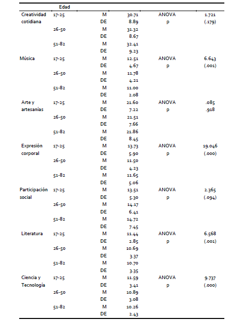 Podría haberse planteado como hipótesis que a mayor edad, mayores logros creativos, sin embargo los datos disponibles refutan este planteo para la mayoría de las áreas. En concordancia con estudios anteriores (Elisondo, 2013) se observó que las personas más jóvenes obtienen puntajes significativamente superior que los mayores en varias de las áreas evaluadas. Aranguren e Irrazabal (2012) también observaron diferencias en algunas áreas de la Escala de Comportamiento Creativo según la edad de los participantes del estudio.