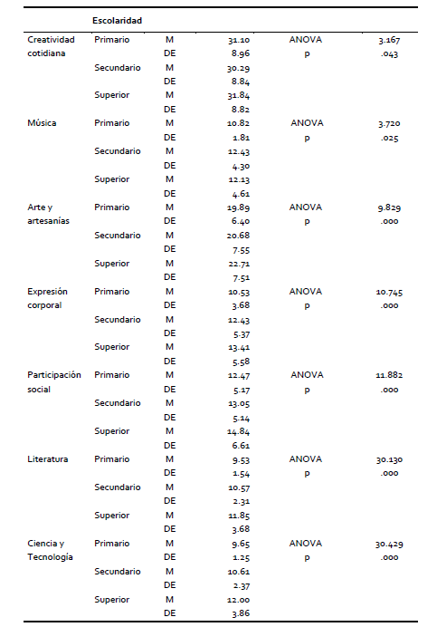 Al igual que en investigaciones anteriores (Elisondo, 2013), los puntajes medios en las diferentes áreas de evaluación de logros creativos ascienden en función del nivel de escolaridad de los sujetos. Las personas con más experiencias educativas obtienen puntajes superiores en todas las áreas y en las puntuaciones totales de medición de logros creativos. Tal vez, la mayor permanencia en el sistema educativo ha ofrecido a las personas mayores oportunidades para desempeñarse creativamente en diversos ámbitos. Estos datos se corresponden en parte con los obtenidos por Aranguren e Irrazabal (2012), quienes observaron diferencias según escolaridad en el área empresas y negocios a favor de personas con mayor nivel educativo y diferencias a favor del grupo con menor nivel educativo en el área expresión corporal.