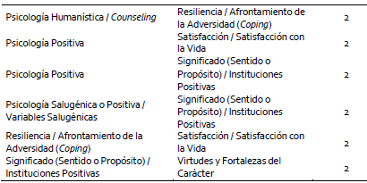 Debe aclararse que no se incluyeron en el estudio los contenidos relacionados con salud mental y salud pública, salud comunitaria, epidemiología, atención primaria de la salud ni psicología de la salud. Al mismo tiempo, es necesario advertir que este sistema de clasificación fue elaborado sólo con un fin metodológico y de manera provisoria, razón por la cual a futuro podrían sumarse nuevas categorías vinculadas con otras temáticas investigadas dentro del campo de la psicología positiva.