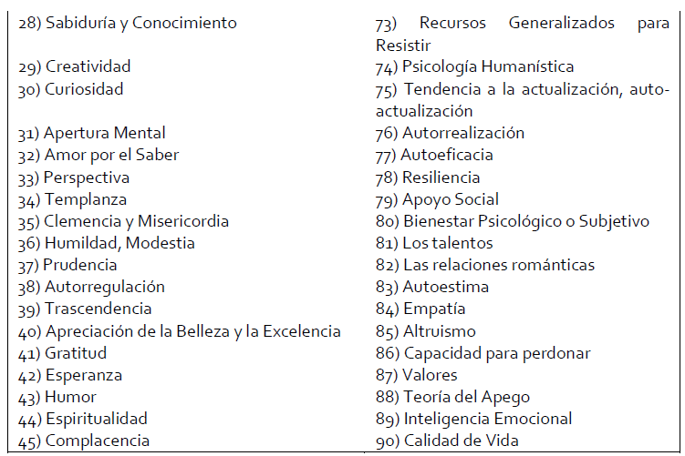 La primera cuestión a resolver consistió en establecer un sistema clasificatorio adecuado que nos permitiera identificar todos aquellos contenidos de los programas de asignaturas objeto de estudio que trataran temáticas vinculadas con el movimiento de la psicología positiva. Con tal fin se construyó un sistema de clasificación que fue sometido a la evaluación de dos jueces expertos en este campo. A partir de sus observaciones y sugerencias, se procedió a definir los 90 términos de búsqueda que se consignan en el cuadro 1.