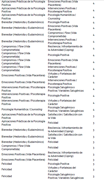 Los dos grandes temas relacionados con la psicología positiva más incluidos en los contenidos de los programas son la Psicología Salugénica o Positiva - Variables Salugénicas y las Aplicaciones Prácticas de la Psicología Positiva. Luego les siguen: las Virtudes y Fortalezas del Carácter, la Psicología Positiva, la Psicología Humanística - Counseling y la Resiliencia - Afrontamiento de la Adversidad [Coping]. También entre las temáticas más frecuentes se encuentran las siguientes: el Bienestar (Hedonista y Eudaimónico), el Compromiso - Flow (Vida Comprometida), las Emociones Positivas (Vida Placentera) y las Intervenciones Positivas -Psicoterapia Positiva.