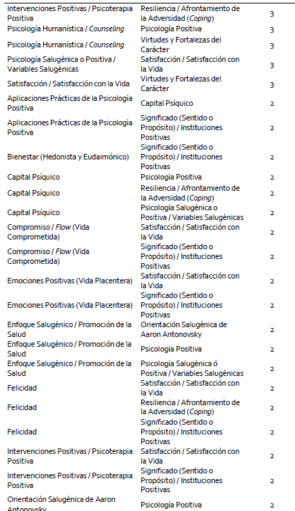 Además de su frecuencia también se analizó cómo estos contenidos se relacionaban entre sí en los programas de los cursos estudiados. Se observaron un total de 128 coocurrencias entre los contenidos vinculados con el campo de la psicología positiva. A partir de los resultados obtenidos puede apreciarse que las Aplicaciones Prácticas de la psicología positiva y la psicología salugénica o positiva - Variables Salugénicas son los contenidos más estrechamente relacionados, dado que presentaron un total de 18 co- citaciones. Seguidamente con más de 10 co-ocurrencias se ubican los siguientes temas: las Aplicaciones Prácticas de la Psicología Positiva y las Virtudes y Fortalezas del Carácter; la Psicología Salugénica o Positiva - Variables Salugénicas y las Virtudes y Fortalezas del Carácter; la Psicología Positiva y la Psicología Salugénica o Positiva - Variables Salugénicas; las Aplicaciones Prácticas de la Psicología Positiva y la Resiliencia - Afrontamiento de la Adversidad (Coping); las Aplicaciones Prácticas de la Psicología Positiva y la Psicología Positiva.