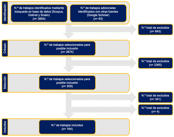 La selección de los estudios considerados en esta revisión se conformó por 4 pasos, descritos en la Figura 1. De esta manera, se recolectaron 3717 trabajos en la búsqueda inicial (3002 en Scopus, 342 en Dialnet, 247 en Scielo y 63 en Google Schoolar). Posteriormente se eliminaron los duplicados (n = 843), quedando para el cribado 2874 estudios. En esta etapa, se procedió a evaluar los trabajos según los criterios de inclusión y exclusión declarados en la Tabla 1. Así, considerando estos aspectos, primero se revisaron los títulos (excluidos n = 1341) y luego los resúmenes (excluidos n = 1024). Posteriormente, se realizó una lectura de todo el texto, eliminando ejemplares que no respondieron a los criterios de inclusión (excluidos n = 341). El cribado dio como resultado 168 estudios seleccionados para la revisión completa.