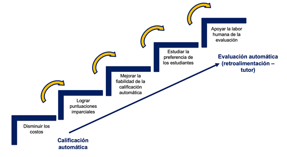 Tal como se observa, estos objetivos se han ido complementando y complejizando cada vez más con la evolución de la tecnología y los cambios de constructos. A su vez, los primeros objetivos se acercaban más a una calificación de los escritos (emulaban la puntuación de un humano), mientras que los últimos se acercan a una evaluación formativa, siempre con el fin de apoyar la labor del productor del texto y su revisor. Por esto, se debe reconsiderar la idea de que las herramientas han sido creadas con el fin de reemplazar la evaluación humana, pues en realidad se plantean como un complemento a la retroalimentación brindada por el profesor y compañeros.
