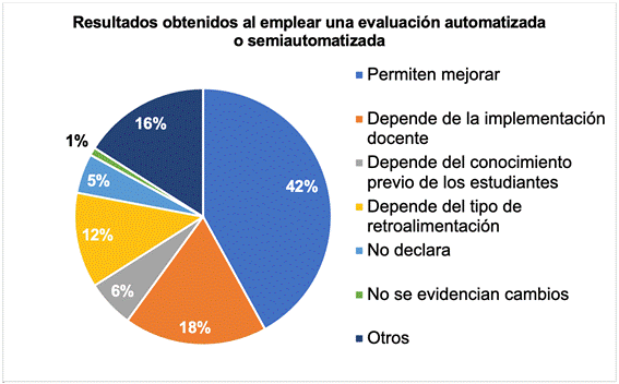 Tal como se evidencia en el Figura 5, la mayoría de los trabajos (42%) que han utilizado evaluación automatizada (motor de puntuación, sistema o tutor de escritura) han obtenido buenos resultados. Estos hallazgos positivos son atribuidos a diferentes factores, por un lado, se sostiene que empleando estos sistemas los estudiantes pueden concentrarse en revisar aspectos más profundos del texto, obviando otros más normativos (Palermo y Thomson, 2018), lo que mejoraría la calidad del escrito. Por otro lado, algunos trabajos exponen que la motivación de los estudiantes a emplear el sistema y la autogestión al utilizarlo impacta en los resultados obtenidos por la herramienta (Wilson y Czik, 2016).
