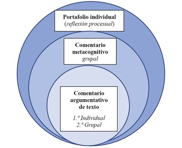 Al final, en el portafolio alojado en aula virtual, escribieron un comentario metacognitivo individual (autoevaluador) de todo el proceso. Para ello, tuvieron en cuenta todos los recursos didácticos y la rúbrica de evaluación, razonando los argumentos por los que valoraron así su trabajo procesual. También escribieron un comentario coevaluador basado en argumentos metacognitivos. A continuación, en la Figura 3, se muestra el flujograma de dicho proceso: