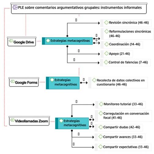 La Figura 10 ofrece el esquema de aprendizajes en estrategias metacognitivas por medio de recursos digitales informales del PLE de los participantes de la investigación, referidos a la coevaluación formativa sobre comentarios argumentativos grupales (videollamadas Zoom, Google Drive y Google Forms).