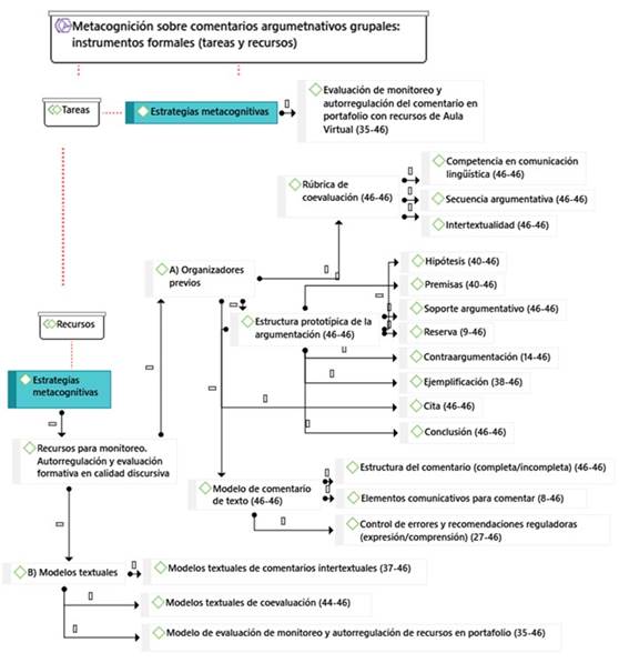 - Recursos de Aula Virtual ha sido útil en el diseño instruccional para la modelización discursiva de comentarios gracias a su repositorio de organizadores previos (46/46) y de modelos textuales (34/46).