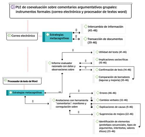 Las subcategorías concernientes a las estrategias metacognitivas implicadas en la coevaluación formativa de los comentarios argumentativos, alojada en los portafolios discentes, han permitido advertir que el PLE empleado oscila entre satisfactorio y excelente en sus resultados. Aquí también se diversifican según el instrumento y se revela un potencial estratégico mucho más potente sobre metacognición en los instrumentos del ámbito formal del aprendizaje: