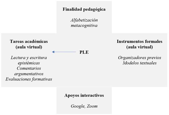 Otro factor innovador de esta investigación es el empleo del Entorno Personal de Aprendizaje o Personal Learning Environments (PLE), concepto tecno-pedagógico que sirve para optimizar el rendimiento como TAC de estos nuevos escenarios formales e informales de uso asiduo de las TIC, atendiendo a tres elementos integrantes: sus herramientas y estrategias de lectura (ámbito del leer fuentes de información multimedia), de reflexión (ámbito del escribir desde servicios con los que transformar la información) y de relación (ámbito del compartir a través de conexiones interpersonales en red personal de aprendizaje) (Castañeda y Adell, 2013). Como se apreciará en la descripción de los elementos integrantes de la metodología investigadora, los recursos digitales usados en los PLE relativos a la tarea compleja de realizar comentarios metacognitivos grupales, destinados a coevaluar los propios comentarios argumentativos de textos multimodales, cubren la mencionada tríada leer-escribir-compartir con diversos recursos informales y formales de aprendizaje.