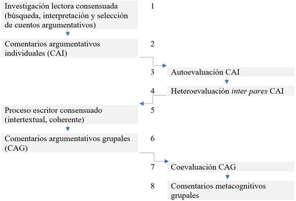 La segunda fase consistió en la escritura procesual y la evaluación formativa de los borradores del comentario argumentativo de textos, hasta llegar a un comentario metacognitivo grupal. Los pasos desarrollados son los siguientes:
