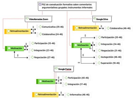 En la Figura 4, a continuación, aparece el esquema que sintetiza la descripción de los aprendizajes de coevaluación formativa respecto del tipo de retroalimentación y de motivación que han sido activados, mediante los recursos digitales informales empleados en el PLE de los participantes en la investigación (videollamadas Zoom, Google Drive y Google Forms).