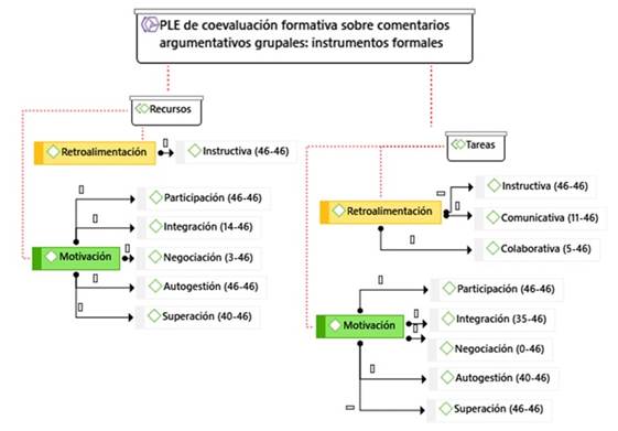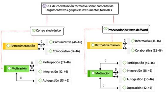 Las subcategorías de la motivación halladas en la coevaluación formativa de los comentarios argumentativos alojada en los portafolios discentes a través del PLE de instrumentos formales e informales favorecen el desarrollo de su competencia discursiva y metacognitiva de modo complementario, por lo que se recomienda su empleo didáctico combinado.