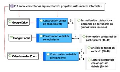 Así pues, se estima la conveniencia de combinar, en el PLE, las herramientas informales con las formales para la realización de comentarios argumentativos grupales, con el fin de combinar estratégicamente los diversos tipos de retroalimentaciones y, en especial, la colaborativa y la instructiva.